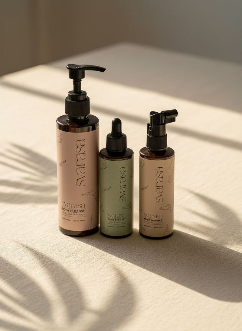 Svarasa Root Revival Hair Growth Oil bottle with text on a beige background
