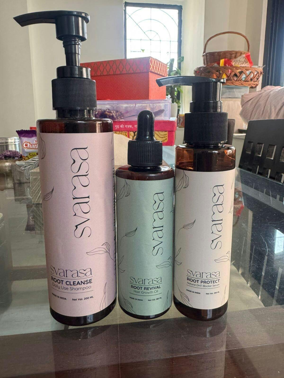 Svarasa’s Root Protect - Natural DHT Blocker Serum is a lightweight, water-based formula designed to combat hair loss and support healthy regrowth. Crafted with nature’s finest ingredients like Pumpkin Seed Extract, Pea Sprout Extract, Green Tea Extract, Wheat Germ Oil and Vitamin E to reduce hair fall and breakage.